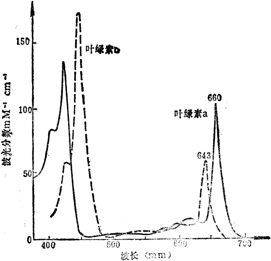 叶绿素能够吸收可见光,不同波长的光被吸收的强度不同。图2是叶绿素在乙醚中的吸收光谱。蓝紫光区域内的吸收峰为所有的卟啉化合物所共有,只有红光区域中的吸收高峰为叶绿素所特有。叶绿素在不同溶剂中,其吸收峰略有不同。如在乙醚中,叶绿素a、b在红光区的吸收峰分别为660和643nm,而在丙酮中则为663和645nm。进一步研究证明,存在于活细胞中的叶绿素其吸收峰也不同于提取在溶剂中的叶绿素,并且已经发现活体内的叶绿素a,按其吸收峰的不同至少有六种形式,即a700、a692、a684、a667、a870和a602,它们在体内的数量也显者不同。叶绿素b也发现至少有两种形式,即b650和b640,叶绿素c2在活体内只有单个吸收峰663nm。