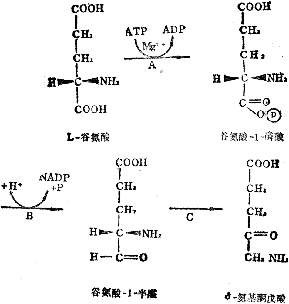 (A=谷氨酸-1-磷酸转移酶;B=谷氨酸-1-半醛;NADP+=氧化还原酶;C=谷氨酸-1-半醛氨基转移酶)