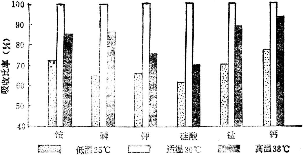 介质通气状况:根系缺氧可能导至离子胁迫。以氮气或CO2代替空气供给根系时,根细胞对K+、NO-3等离子的吸收几乎降至零。不同物种的离子吸收对氧分压的要求有所差异。水稻离体根系K+的吸收量达最大值时的氧分压为3%,而番茄的相应氧分压为5—10%。氧气缺乏还会通过降低氧化还原势,增加根部介质中有害还原性物质的积累。降低地下水位和中耕松土等改善土壤通气条件的措施,除能促进养分的吸收外,还可以消除过量CO2、硫化物、乙醇和乙醛等的毒害作用。②温度效应:温度过高或过低都会降低离子的吸收速率。在一定温度范围内,植物对离子的吸收速率随温度提高而加大。离子吸收的最适温度因物种不同而有一定差异,如水稻约为28—32℃。温度影响离子吸收的原因是多方面的。离子吸收与细胞的代谢过程特别是呼吸作用有密切联系,这些酶促生化反应对温度变化极为敏感。不适宜的温度虽然都会影响离子吸收速率,但对不同离子的影响程度是不相同的(见图2)。温度由30℃降至25℃或升到38℃时,各种养分的吸收都有减少,但减少的幅度有差异。温度变化对同一营养元素的不同形态离子吸收的影响也是不同的。例如当温度降至16℃时水稻已经几乎不能吸收NO-3-N,但还能部分吸收NH+4N。在农业生产上,当温度不适而引起养分胁迫时,单纯增施肥料往往不能解决问题。③pH值影响:根际pH除对离子吸收具有直接效应外,还能通过改变营养元素的溶解度间接影响离子吸收。通常在一定范围内,pH升高时,阳离子吸收增加。pH降低时,阴离子吸收增加。例如根际pH由酸性变为中性时,燕麦对K+的吸收速率随着pH升高而增加。而当pH由6.0升至7.4时,却降低了小麦对NO-3的吸收。pH对磷吸收的影响较为复杂,32P试验表明,pH从4.0增至6.5时,32P的吸收逐渐减少,这是由于易吸收的一价磷酸根转变为较难吸收的二价磷酸根。pH升至7.0以上时,易于形成不溶性的磷酸钙,pH过低磷又可能被铁、铝所固定。因此一般在pH6.5—7.0时最有利于磷的吸收。