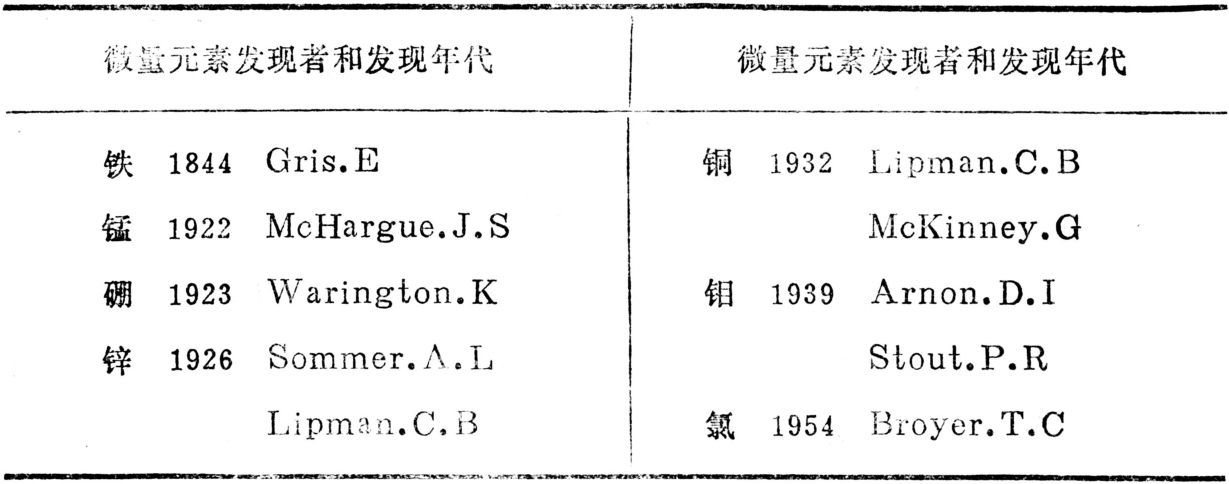 植物需要量甚微的必需元素(见必需元素)。1844年E.格瑞斯证实铁(Fe)是植物生活中不可缺少的营养元素,这是第一个被确认的植物微量元素。1954年布T.C.罗伊尔证实氯(Cl)是第七个微量元素(见表)。其间陆续发现的微量元素有:锰(Mn)、硼(B)、锌(Zn)、铜(Cu)、和钼(Mo)(见表)。这几种微量元素在植物体内的含量通常低于干重的千分之一。