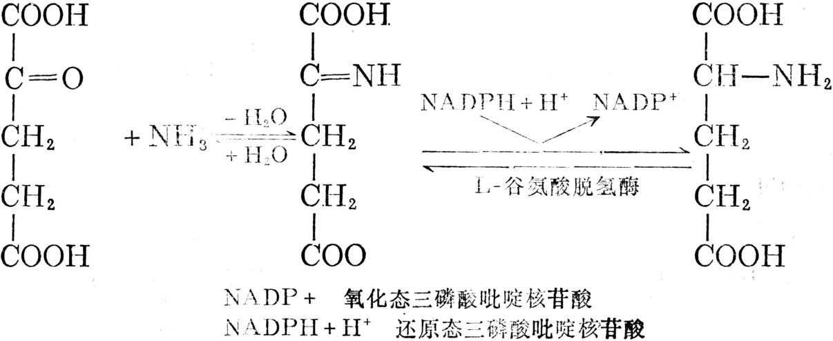 由α-酮酸与NH3作用,生成亚氨基酸,然后亚氨基酸被还原而形成氨基酸。实际上如α-酮戊二酸转变为谷氨酸的反应。