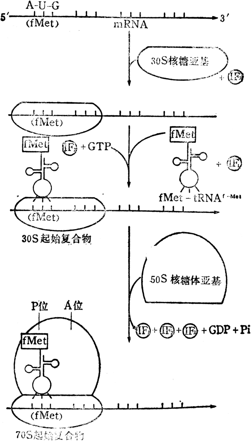 以大肠杆菌中70s起始复合物的形成为例,通常在起始密码子AUG分侧7—8碱基处有信号顺序(常为AGGA),可与核糖体小亚基的16 sRNA分端互补碱基配对,为起始密码子正常定位,然后在起始因子(IF-1,IF-2和IF-3)参与下,载有甲酰甲硫氨酸的tRNA结合在mRNA的起始密码子处,当大亚基被结合时即形成完整的起始复合物,同时GTP水解成鸟苷二磷酸(GDP)和无机磷酸(Pi),起始因子即被释出。此时,甲酰甲硫氨酸tRNAf(fMet-tRNAf)占有核糖体上的肽酰位点(P位),空着的氨酰tRNA位点(A位)准备接受下一个氨酰-tRNA。真核生物通常依靠mRNA5′帽子结构与核糖体小亚基结合,起始密码子也是AUG,起始氨基酸也是甲硫氨酸,但不必甲酰化,起始因子9—10种。