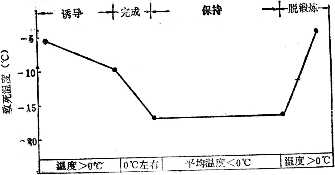 抗寒锻炼是需能代谢过程,除适宜的环境诱导外,需要供应营养物质和水分。通常分为诱发、建成和保持三个阶段(见图)。然后随温度回升而解除锻炼。