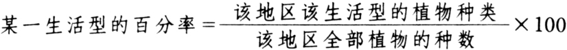 某一区域或某一植物群落的各类植物生活型百分比。调查研究生活型谱,可以清楚地分析出该地区某一植物群落中植物与生境(特别是与当地的气候)的关系。制订生活型谱的方法,首先是调查整个地区(或某一个植物群落内)的全部植物种类,确定每种植物的生活型,将相同的生活型按照生活型系统归纳在一起,然后用下列公式求算出生活型的百分率: