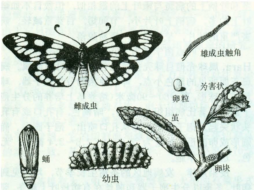 成虫体长18~22毫米,翅展55~67毫米,头、胸部及腹基部蓝黑色,腹部大部黄色,前后翅均蓝黑色,有光泽,翅面内横线位置均有1个黄色白色阔带,端半部散生黄白色斑点。卵椭圆形,乳黄色,常数十至百余粒堆成卵块。幼虫体形肥厚,黄褐色,长20~30毫米,体背除首末两节外,各节均生有疣突,中、后胸各有疣突5对,腹部1~8节各有3对,第4腹节两对疣突上生有无毒短毛。蛹长19~21毫米,黄至黄褐色;茧淡棕褐色,长椭圆形,结于叶面中脉处,叶缘随之向上卷折。