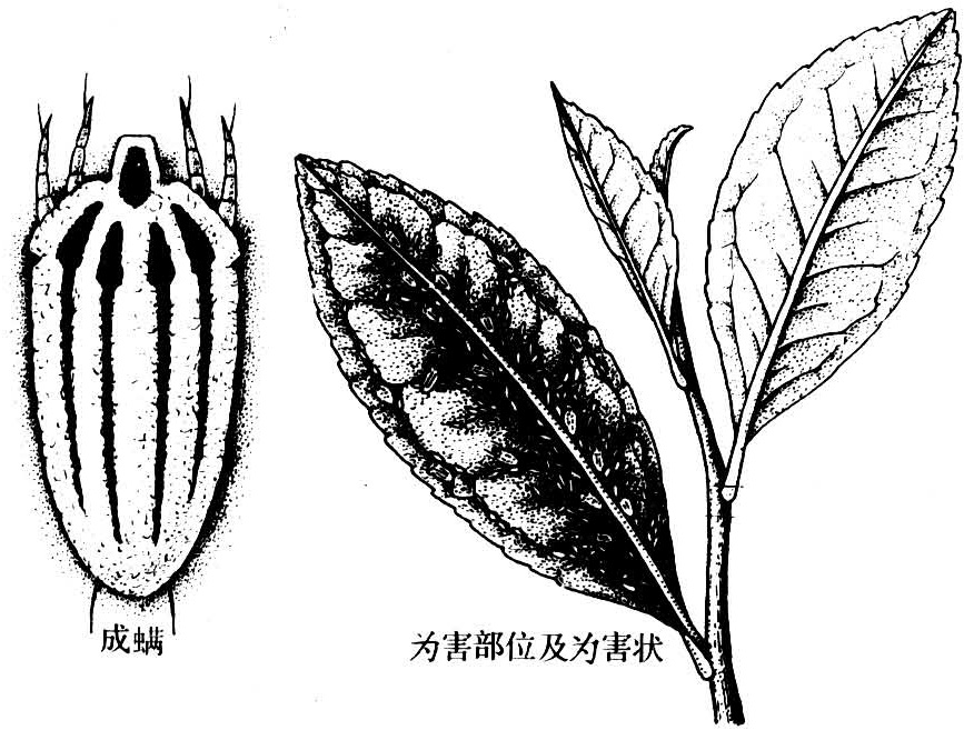 中国各产茶省均有分布,常与茶橙瘿螨混杂发生。苏联、日本、印度、斯里兰卡、印度尼西亚、越南等产茶国亦有发生。成螨和若螨刺吸茶叶汁液,致叶片失去光泽呈古铜色,叶面沿叶脉密布白色尘埃状蜡质蜕皮壳,叶脆易裂,严重时大量落叶。