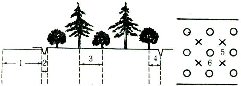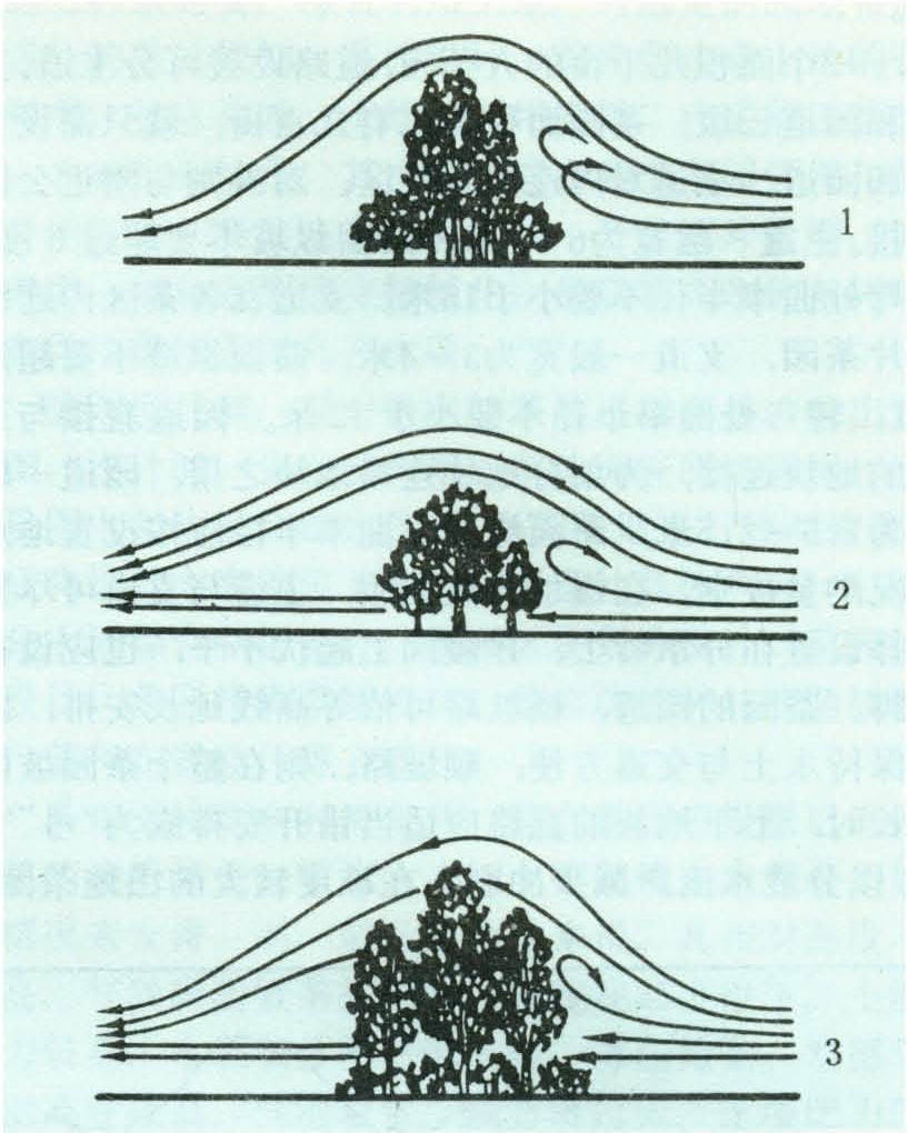 茶园防护林的主要作用为防风防寒,保持水土涵养水源;遮荫树的作用则为调节光强度,降低叶温,增加土壤养分,保持旱季土壤水分。中国广大茶园,自北至南皆有风害寒害,水土冲刷为害,皆应计划布置茶园防护林。至于茶园遮荫树,一般认为中国南亚热带与热带茶区如云南、广西、广东的一部分与海南岛、台湾南部外,是可以不设置的。茶园防护林的设计,应注意防护林的布置与防护林的结构(图4)。