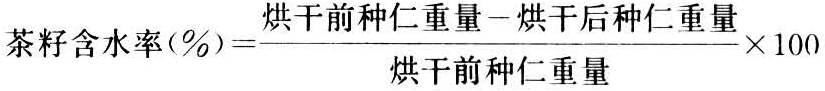随机抽取茶籽50粒,剥去外种皮,称种仁的重量,放在105℃的干燥箱中,烘10多小时,取出称其重量,再继续烘2~3小时,再取出称其重量,直至衡量为止。用红外线水分测定器则较为简单,测出失水重量。