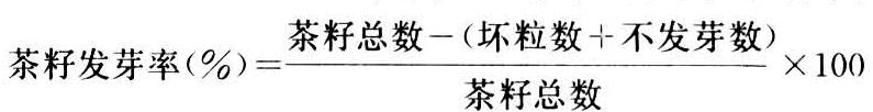 随机取已成熟的茶籽100粒,剥去种皮,剔除坏子,将种仁在20~50℃温水中浸3~4小时,在发芽盘内垫一层吸水纸,铺2厘米厚的细砂,将浸湿的种仁均匀埋在砂中,不露出砂面,加入清水,使纸和砂完全浸湿为度,将发芽盘放在发芽箱或温箱里,温度保持25~30℃,注意添水换气,约经一周,种仁开始发芽,每天检查发芽数,经半个月发芽可结束。