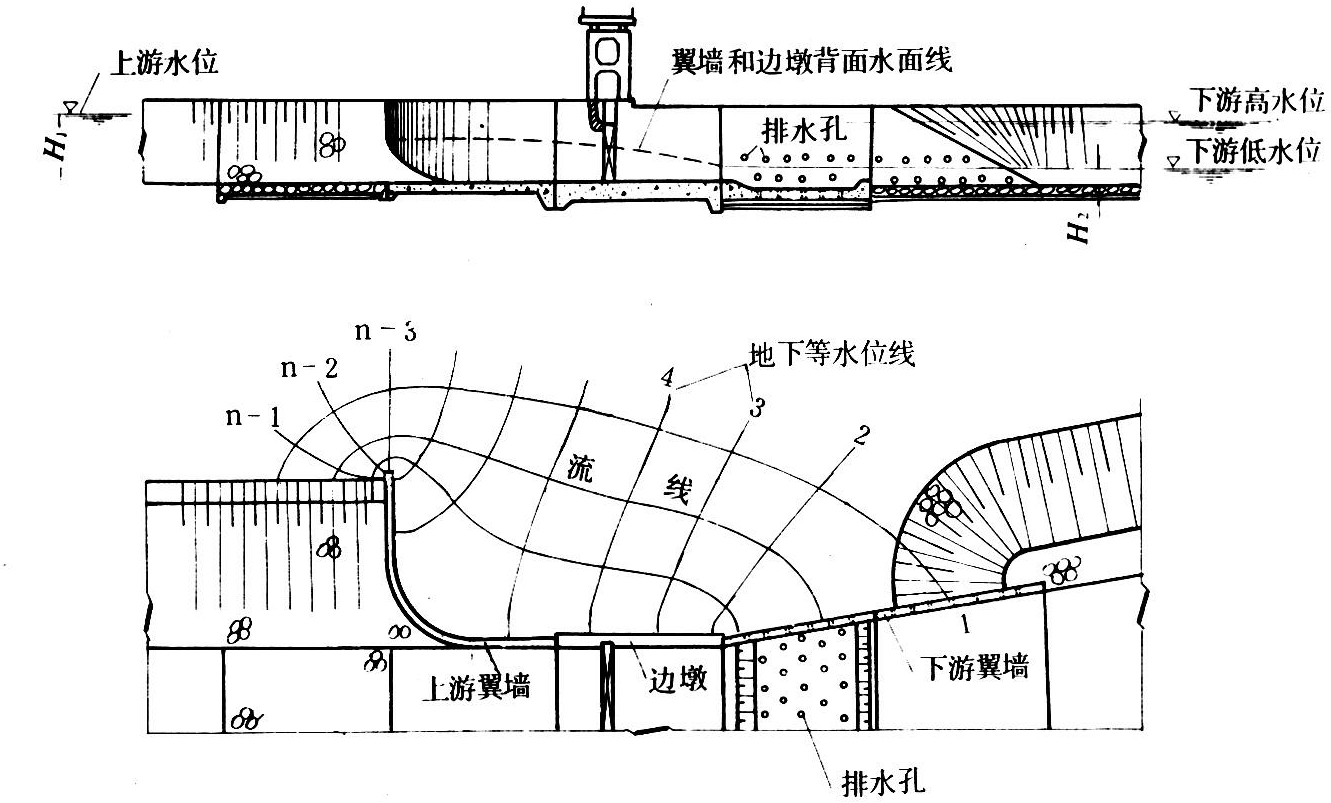 从闸坝上游绕过两岸连接建筑物向下游渗透的水流。如图在翼墙和边墩后的土体中发生的岸边绕流,具有自由水面,是无压空间渗流,解决这一问题比较复杂,通常需用电模拟试验求得解答。为了简化计算,当河岸土质均匀等向,渗流区底部具有水平不透水层