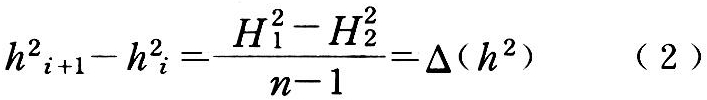 式中 H1、H2分别为上、下游水面到水平不透水层的高差(渗流水深);hi、hi+1为自下游水面起从1开始编号,由下游向上游顺序的第i条及第i+1条等水头线的水头(渗流水深);n为等水头线的数目。