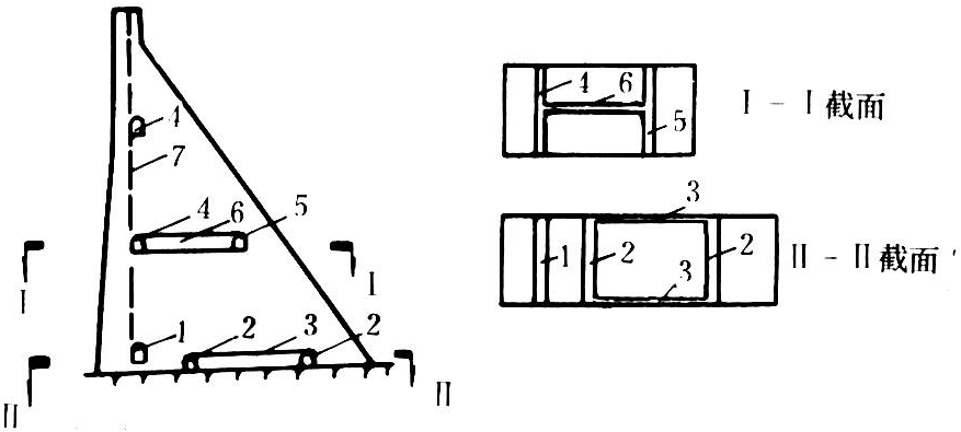 坝内廊道多用圆顶矩形断面,骑缝横向廊道也可用三角形顶矩形断面。基础灌浆廊道尺寸较大、宽约2.5~3.0米,高约3.0~4.0米;操作廊道尺寸要根据设备及操作需要而定;其余廊道最小宽度1.2米,最小高度2.2米。廊道内应设置照明设备,陡坡段还常设置安全平台及扶手。坝内廊道会引起应力集中,可能在周围产生局部拉应力,需适当配置钢筋。