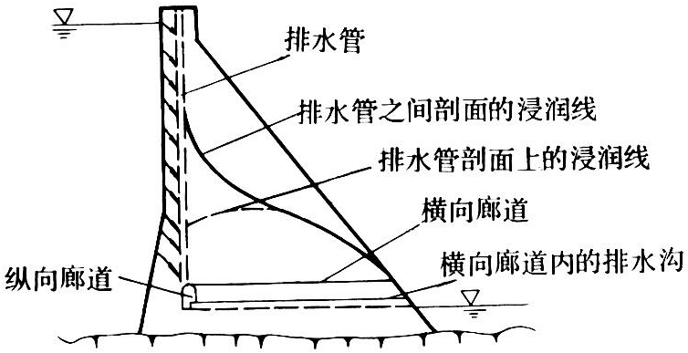 坝体排水管通常做成铅直的或接近铅直的,位于上游侧防渗混凝土层之后,与上游坝面的距离一般不小于坝前水深的1/10~1/12。其上端通到坝顶(或溢流堰面以下),下端通到纵向排水检查廊道或基础排水廊道。通过廊道排水沟或集水井再将渗水排向下游(见图)。