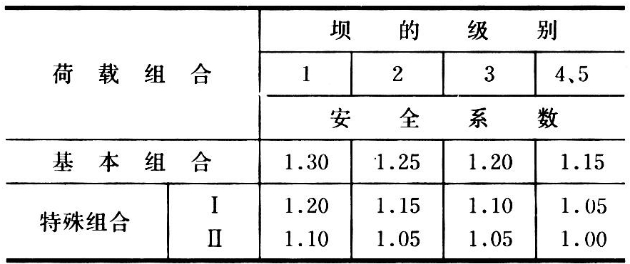 中国现行规范按坝的级别及作用力荷载的组合情况,对要求的抗滑稳定安全系数〔K〕规定如表。