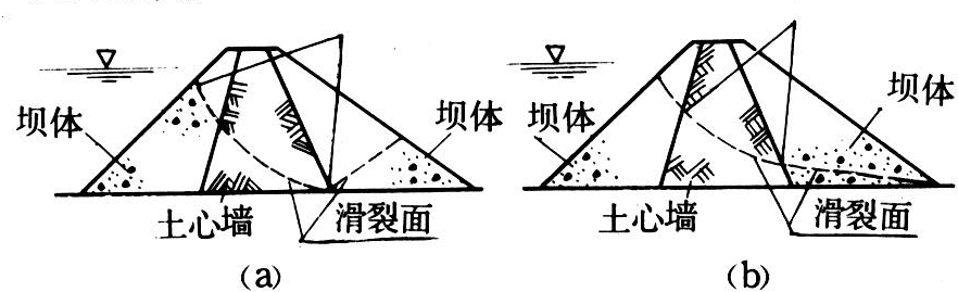 对于塑性心墙土石坝,滑裂面如图2,a、b所示的圆弧与折线组成。其稳定计算可以按圆弧法进行,也可分段计算