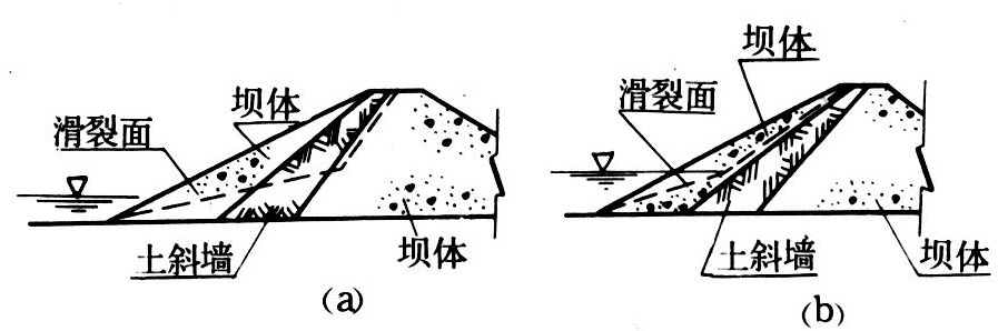 对于土斜墙及其保护层的稳定问题,不仅要核算斜墙与保护层共同沿斜墙底面滑动(图3,a),而且还应核算保护层沿斜墙顶面的折线滑动(图3,b)。当计算不同土层接触面的滑动时,其抗剪强度应该采用两层中的较小值。