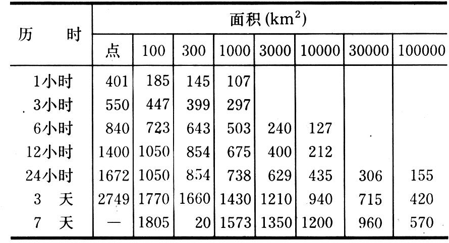 为了检查流域设计雨量值,还可对一个固定的地区制作实测和调查最大时面深关系表(动点动面),该表给出各历时各面积的实际发生的最大雨量。