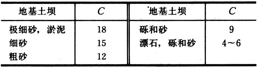 1910年,W.G.勃莱根据一系列建造在土基上的成功的和失败的闸坝地下渗流观测资料的分析成果指出,闸坝的地下轮廓线是渗流的一条主要通道(称为爬路或渗径),渗水沿爬路流动所遇到的阻力远比通过地基土空隙的阻力为小,应以沿爬路的渗流来判断能否发生管涌。为了防止发生管涌,勃莱提出,土基上闸坝地下轮廓线长度(也可称为渗径长度或爬路长度)L应不小于他推荐的安全渗径—水头比C(即勃莱渗径系数)与渗透水头H的乘积,即L≥C·H。各种地基土类的勃莱渗径数C如表中所示。勃莱假定渗流沿爬路各点的渗透坡降和渗透流速都不变,可按直线比例关系求出爬路任一点的渗压水头,即h=H·x/L,x为计算点沿爬路至地下轮廓线末端的长度,因此,勃莱法又称为直线比例法。
