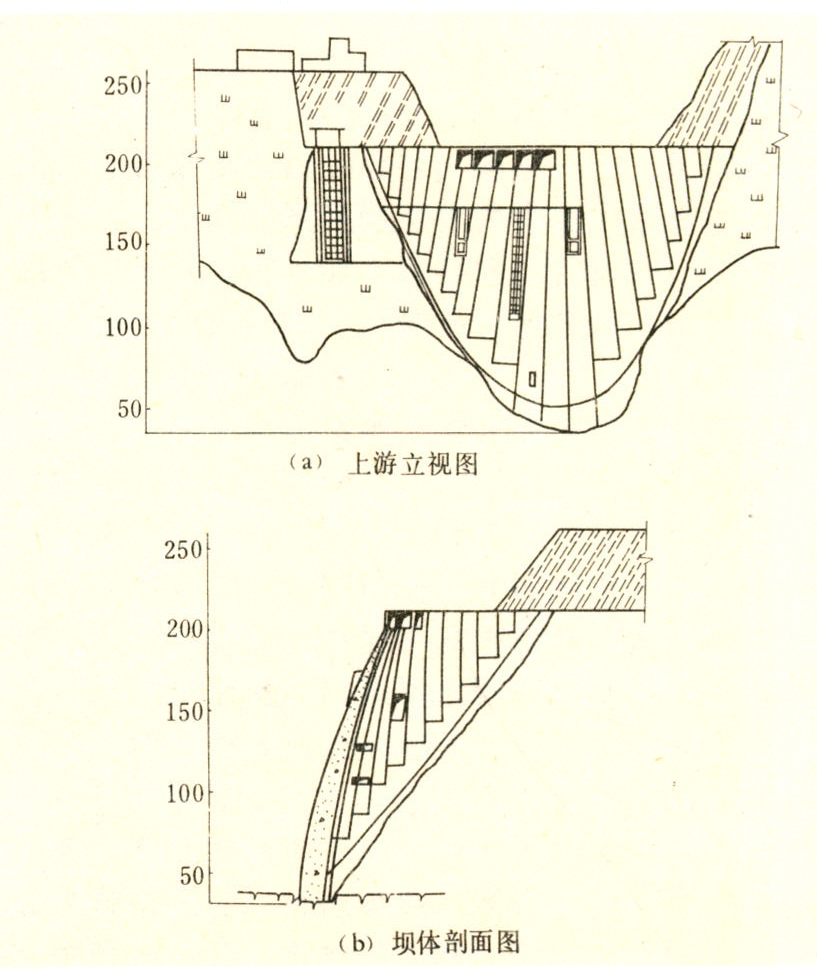 整个工程1969年10月开工,1974年5月建成。主要建筑物有:混凝土双曲拱坝,高181米,坝顶长290米,坝顶厚4米,坝底厚20米。为保证通过坝身经达见峡下泄的流量不超过3200米3/秒的限度,坝顶设有带闸门的4孔溢流堰,可泄洪1600米3/秒,坝体设置水头为60米的两条宽4.3米、高6.5米的深孔,可泄洪1600米3/秒,兼可排沙。左岸隧洞设有扇形进水塔及5孔闸门,水流沿斜井与反弧段以明流方式流经长693米、直径11.6米的马蹄形隧洞下泄,以挑流方式消能,设计泄洪能力3200米3/秒,全部泄洪设施最大泄流量为6400米3/秒。此外,坝身在最高库水位以下90米深处还设有两个直径2.2米的放水阀孔,可泄水250米3/秒,用于放空水库。电厂为地下厂房,装有3台机组,总容量为23.4万千瓦。