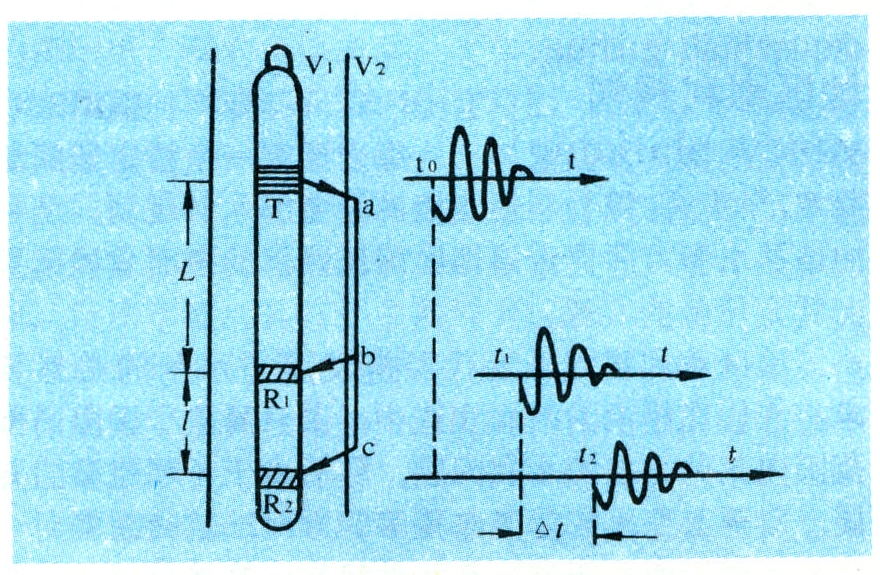 声波测井 利用声波在岩、土体传播的特性来研究钻井地层剖面的方法。目前运用声波的基本参数有纵波速度、横波速度、振幅等。它们由岩石骨架和孔隙中流体的弹性、密度等物理性质所决定,而这些性质和岩体结构、孔隙的大小、裂隙发育程度与方向、饱和流体的种类和岩石的机械强度等一系列地质因素密切相关。利用声波测试岩土体的物理力学性质,已广泛采用。声波在岩土体中传播按波动方程式的规律进行,即传播速度决定于介质的弹性系数和密度。目前国内声波测井仪主要采用两种装置,一种是单发射双接收的装置(见图)。仪器记录滑行波到达两个接收器的时间差。测量间距愈小,仪器分辨地层能力越强,反之,间距愈大分辨能力越差。图中:T为发射器;R1、R2为到达接收器;V1为泥浆水的速度;V2为岩层的速度;t1、t2为到达接收器所需时间;Δt为时间差。