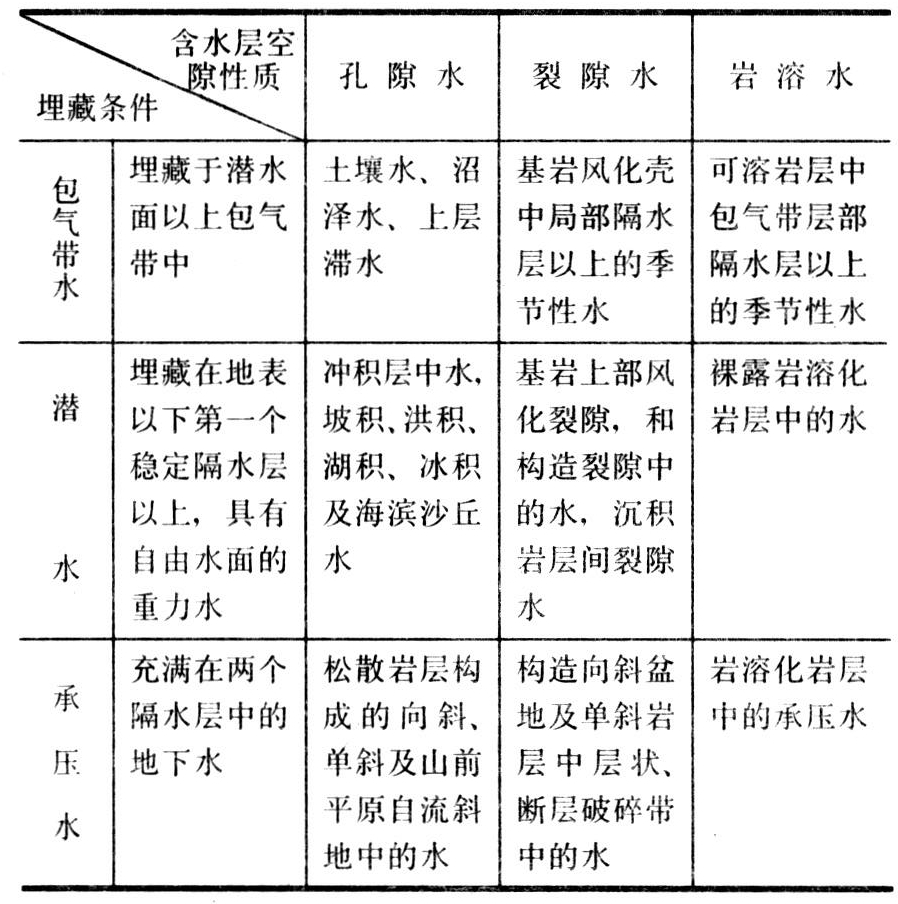 地下水分类 地下水分类是地下水研究、地下水资源估算与评价的基础。分类方法很多,根据地下水埋藏条件和含水层性质的分类方法应用最广,这种分类见表。