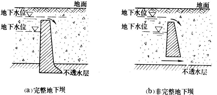 由含水层或加建地下坝所形成的地下水调蓄容积。通过地下水库的调蓄,可改变地下来水与用水在数量和时间上的不适应性;通过含水层的过滤与净化,可改良水质。地下水库类型 分有坝与无坝两类。前者又分为完整坝与非完整坝(如图 1)。完整坝是穿透整个含水层的坝,可全部拦截地下潜流,当水库蓄满时,溢流下泄,非完整坝不穿透整个含水层,只能拦截部分潜流,当水库蓄满时,坝顶及坝底均有水流下泄。