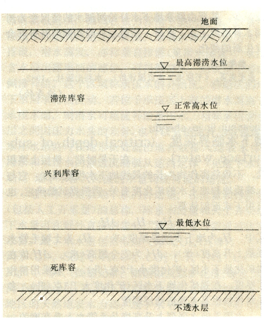 地下水库特征水位 地下水库的特征水位有:最高滞涝水位、正常高水位和最低水位(见图2)。最高滞涝水位取决于作物耐涝特征及其抗渍能力,它与正常高水位之间的水库容积称为滞涝库容;正常高水位亦称兴利水位,除汛期以外,地下水库正常蓄水位应以不引起土壤盐碱化与保证作物高产为准。因此它与地下水的矿化度、土壤质地、水文、气象、作物栽培技术、作物种类及生长期、农业措施等有关。正常高水位与最低水位之间的水库容积称为兴利库容;地下水库最低水位亦称“死水位”,是开采地下水过程中允许达到的最低水位,主要取决于入库水量的大小及不发生破坏性的地质现象为准。最低水位以下的库容,称为“死库容”,它并不是常量,随着各种影响因素而变。