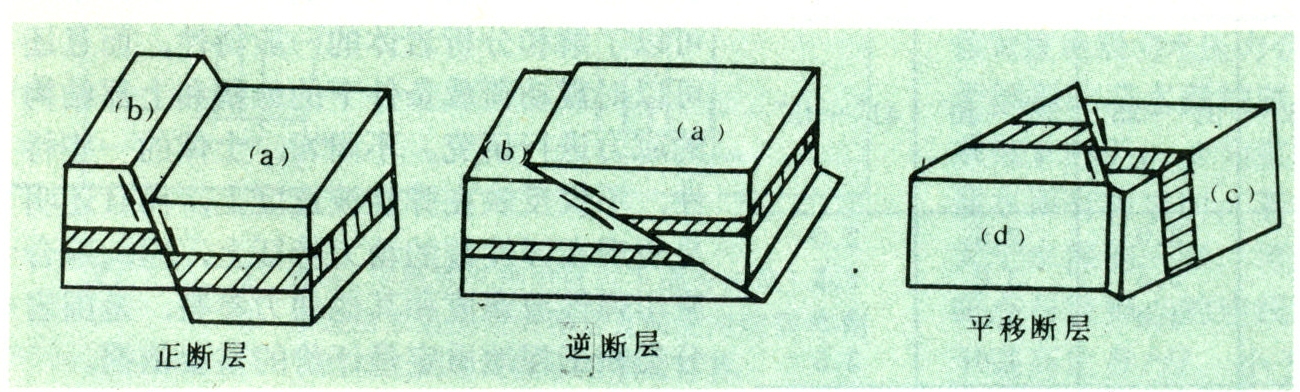 组成地壳的岩层受地应力作用而发生位移、变形留下的形迹种类。地质构造的基本类型有:①褶皱构造岩层受力发生的波状弯曲。地壳岩层中褶皱的规模差别极大,从显微构造直到巨大的构造盆地。水平挤压作用是褶皱形成的主要原因,在硬软岩石互层时,随着褶皱作用而出现层间错动、层间塑性变形以及层间破裂面,这些现象是水利工程建设中必需引起注意的问题。褶皱的形态多种多样,但其最基本的类型只有两种:岩层向上弯曲,形成中心部分为较老岩层,两侧岩层依次变新为背斜;岩层向下弯曲,中心部分是较新岩层,两侧部分岩层依次变老为向斜,见图1。②断裂构造岩石在断裂变形阶段产生的构造形迹,它是地壳上发育最广泛的一种地质构造。又可分为节理与断层两类。节理两侧岩体沿断裂面没有发生明显的位移,或仅有微量的位移;断层则产生显著的相对位移。节理经常同褶皱、断层等相伴出现,或作为它们的派生构造而存在。它使岩层丧失连续性,强度降低,变形增大,具强烈的各向异性。直接形成节理的应力有两种,一是剪应力,一是张应力,由此把节理分为剪节理和张节理,前者沿剪切面发展而成,经常成对出现;后者在垂直于张应力方向上产生裂割式的破裂面。此外,节理的间距小密度大时,就可称为劈理。它的密度与岩性关系很大,一般泥岩及板岩内劈理间距1~2毫米,砂岩、灰岩为5~10厘米。断层往往是由节理进一步发展而成的,它们的力学成因,并无本质差别,但断层规模较大。根据断层面两侧岩块相对移动的性质,把断层分为:正断层(即断层面的上侧岩块,相对断层面下侧岩块向下移动的断层)、逆断层(即断层面的上侧岩块,相对断层面下侧岩块向上移动的断层)、平移断层(即断层面两侧的岩块沿断层面延伸方向相对移动的断层)(见图2)