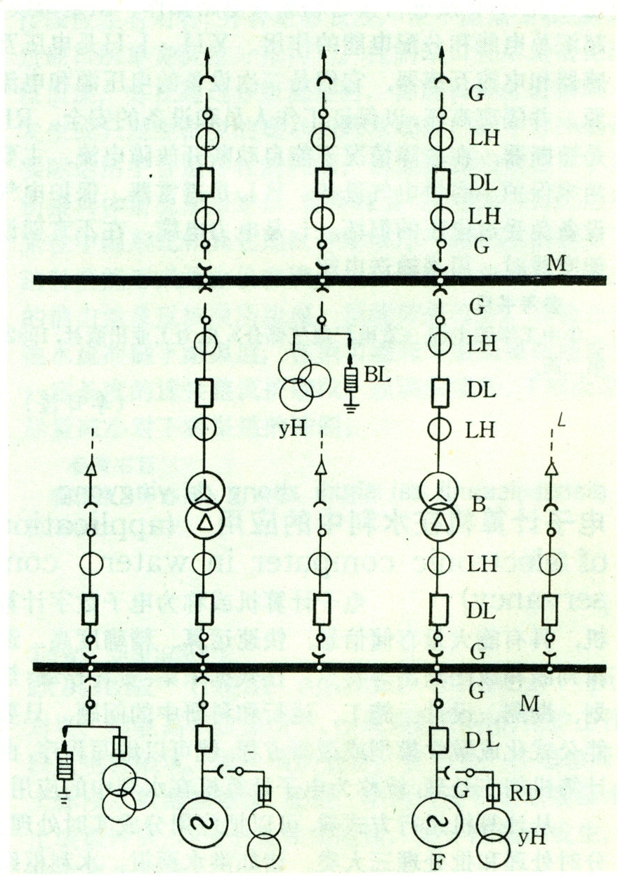 图中F是水轮发电机。B是升压变压器。它将发电机电压升高,通过输电线把电能送入电力系统或输送到较远的用户。变压器有普通型和自耦型两类。可以制成单相或三相,双绕组或三绕组等型式。DL是高压断路器。在正常运行时用它接通和断开电路,在故障情况下,能自动迅速开断故障电流。根据绝缘及灭弧介质不同,高压断路器分为少油式断路器,多油式断路器,空气断路器,六氟化硫断路器,真空断路器等。G是隔离开关。用来隔离电压。在需要检修部分的两端,用它构成足够大的明显可见的空气绝缘间隔,保证检修工作的安全。由于它没有灭弧装置,不能用来接通或断开负荷电流,只有在电流很小的电路,当隔离开关触头上不会产生强大电弧时,按有关技术规定才允许单独进行接通和断开电路操作。M是母线,起汇总电能和分配电能的作用。YH、LH是电压互感器和电流互感器,它们是二次设备的电压源和电流源,并隔离高压,以保证工作人员和设备的安全。RD是熔断器,在故障情况下能自动断开故障电流,主要用来保护小容量电气设备。BL是避雷器,保护电气设备免受过电压的损坏。L是电力电缆,在不宜架设架空线时,用来输送电能。