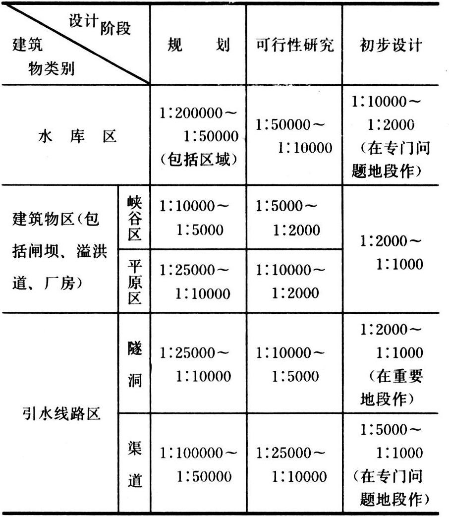 工程地质测绘要使用符合精度要求的同等或大于地质测绘比例尺的地形图。工程地质测绘比例尺分为小比例尺(1∶200000~1∶50000),中等比例尺(1∶25000~1∶10000)和大比例尺(1∶5000~1∶1000)三种。各设计阶段工程地质测绘比例尺的选择,可参阅下表。