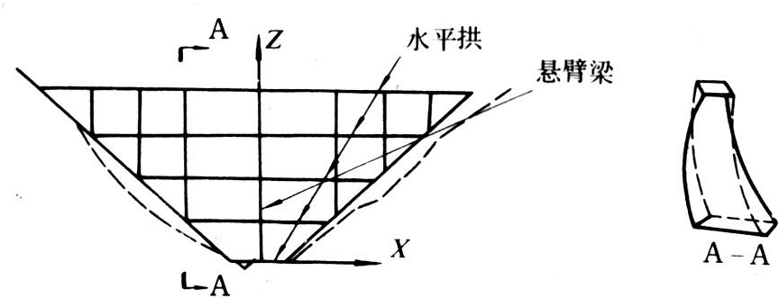 悬臂梁体系由一系列独立的悬臂梁组成,总的体积和外形与拱坝相同,依靠梁的抗弯和抗剪作用,将分得的荷载传至梁底岩基。为计算方便,选取梁的位置与拱交于基面某一点,并沿拱的半径方向切取1米来计算。若拱坝各层拱的曲率半径是变化的,梁的侧面即为扭曲形,如图1A—A 所示。