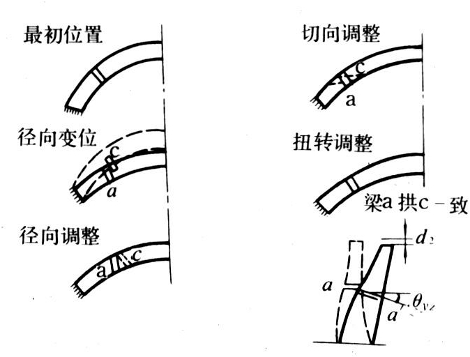 yz并不相同,必须在梁和拱之间加一对内力,促使二者的切向变位和扭转角变相等。在以上径向、切向和扭转调整结束后,梁、拱的径向变位又不一致,还须再调整径向荷载的分配。这就是变位调整的计算步骤,如图2所示。采用电子计算机以后,变位与荷载的关系,可以列出代数方程组一次解得,这就是一次全调整,它比逐次调整的精度高。