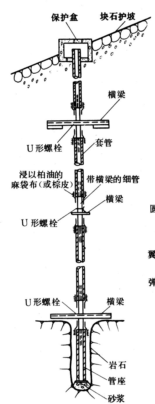 电磁式沉降计 是一种装有舌簧开关的测头,当测头穿过一个永磁铁的磁场时,将产生电磁感应,以此来测定永磁铁(亦称沉降环)的位置。在施工过程中,将直径为30~50毫米的硬质塑料管或波纹伸缩管,逐节垂直埋在坝体内,每节长度根据施工情况而定,中间以套管套接。随着施工进展,每隔一定的高程在管外侧套埋永磁性沉降环一个,作为测点(见图4)。沉降环随土体的固结而沉降。观测时,用带有测绳的测头逐点量测沉降环到管顶的距离,计算其高程变化,即为该点的沉降量,并以此计算分层固结量。另一种电磁式沉降计是采用振荡电路式磁头,用普通钢环或环形钢板作沉降环。电磁式沉降计可在土坝施工后钻孔埋设,且自动化程度高,美国、日本等国已在推广使用,中国也已试制成功,并投入实际运用。