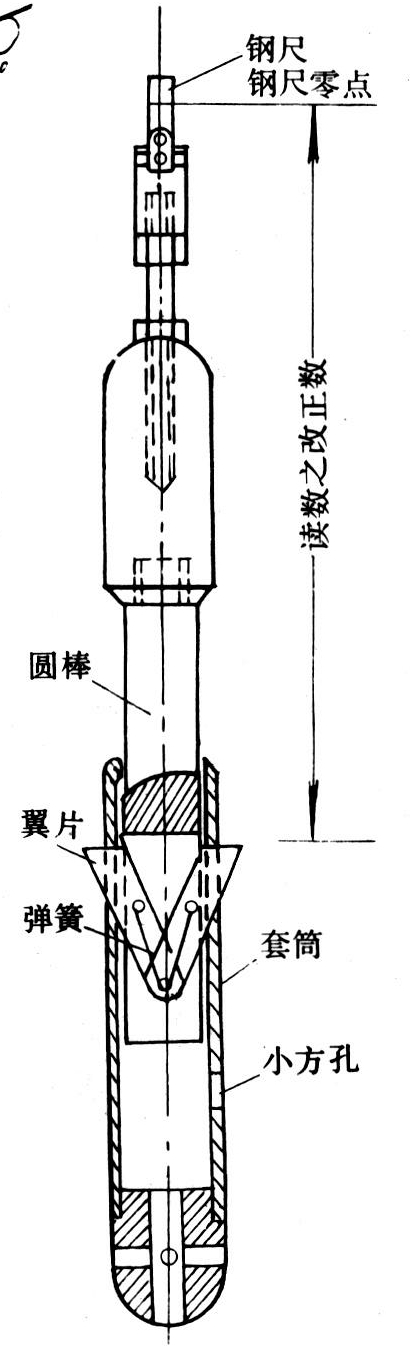 横梁式固结管 由管座、套管、带有横梁的细管和保护盒组成(见图 1)。管座和套管均为直径50毫米的钢管。带有横梁的细管为直径38毫米、长1.2米的钢管,在管长一半处用U 形螺栓与带有翼板的横梁正交焊接。细管的下端管口作为测点,并以此点推算翼板的高程。翼板随土体的固结和基础的沉降而向下移动。观测时用测沉器自上而下逐次测定各测点到固结管管顶的距离,求出翼板的高程变化,进而计算翼板间土体的固结量。测沉器由铁棒和套筒组成(见图2)。其外径略小于固结管细管的内径,圆棒下部的开槽内装有弹簧翼片,用以卡着细管下口。施测时,最好使用弹簧秤,按固定拉力拉紧钢尺以保证观测精度。