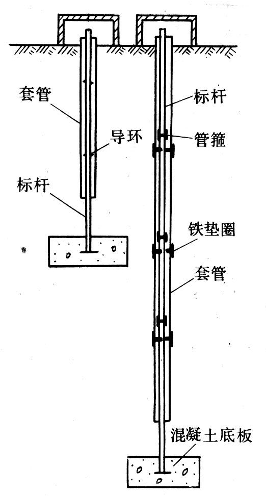 深式标点组 由埋在坝体内不同高程的两个或两个以上的深式标点组成。每个深式标点由底板(测点)、标杆、套管和保护盒组成(见图3)。观测时,用精密水准仪测得标杆顶点高程,此值减去标杆长度即为测点高程;再与测点始测或上次所测高程对比,可得测点高程变化;然后即可计算出测点间土体的固结量或基础沉降量。