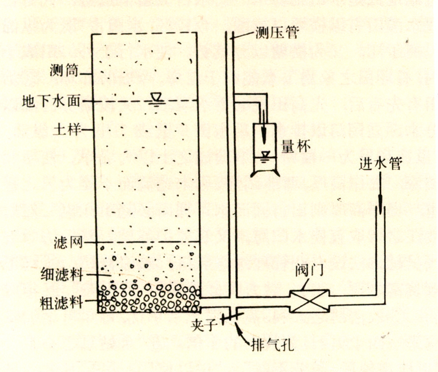 抽水试验法可以求得常数给水度的近似值。确定变值给水度的方法有筒测法、水文动态法与计算法。筒测法简单易行,获得资料快,只要土样处理好,可以得到较满意的成果。其装置如图。给水度的测定方法是:首先由进水管充水,使测筒土样饱和,关闭阀门,在无蒸发条件下将测压管的三通管预降至待测深度,土样中的水即由测压管三通口流入量杯,直至无水流出,测其体积,对不同降深按上述步骤,可得到各降深范围内的平均给水度。水文动态法是利用平原河流的水文资料及地下水位资料,根据流域水量平衡式推求。计算法是用土壤水能量理论,通过求解土壤水非稳定流运动方程求出给水度随埋深而变的关系。