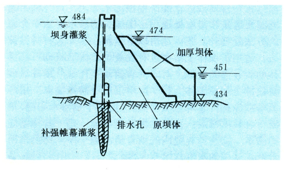 浆砌石坝滑塌处理 当浆砌石坝坝基地质条件不好、岩石破碎或坝基存在软弱夹层、或原设计采用的摩擦系数偏大,使坝坡太陡、或施工质量太差,均有可能造成砌石坝体产生滑塌破坏。可采用①锚索锚固法。有条件时,可于坝顶钻孔,直达基岩,以钢索锚固,增加坝体抗滑稳定性。阿尔及利亚谢尔法砌石重力坝采用这种方法进行处理,效果良好(见图2)。②灌浆和加固坝体的综合措施。对浆砌条石重力坝,施工质量不好,坝体多处裂缝渗水,坝基严重渗漏,可采用坝体灌浆、补强,坝基灌浆帷幕和加厚坝体的综合修理措施(见图3)。