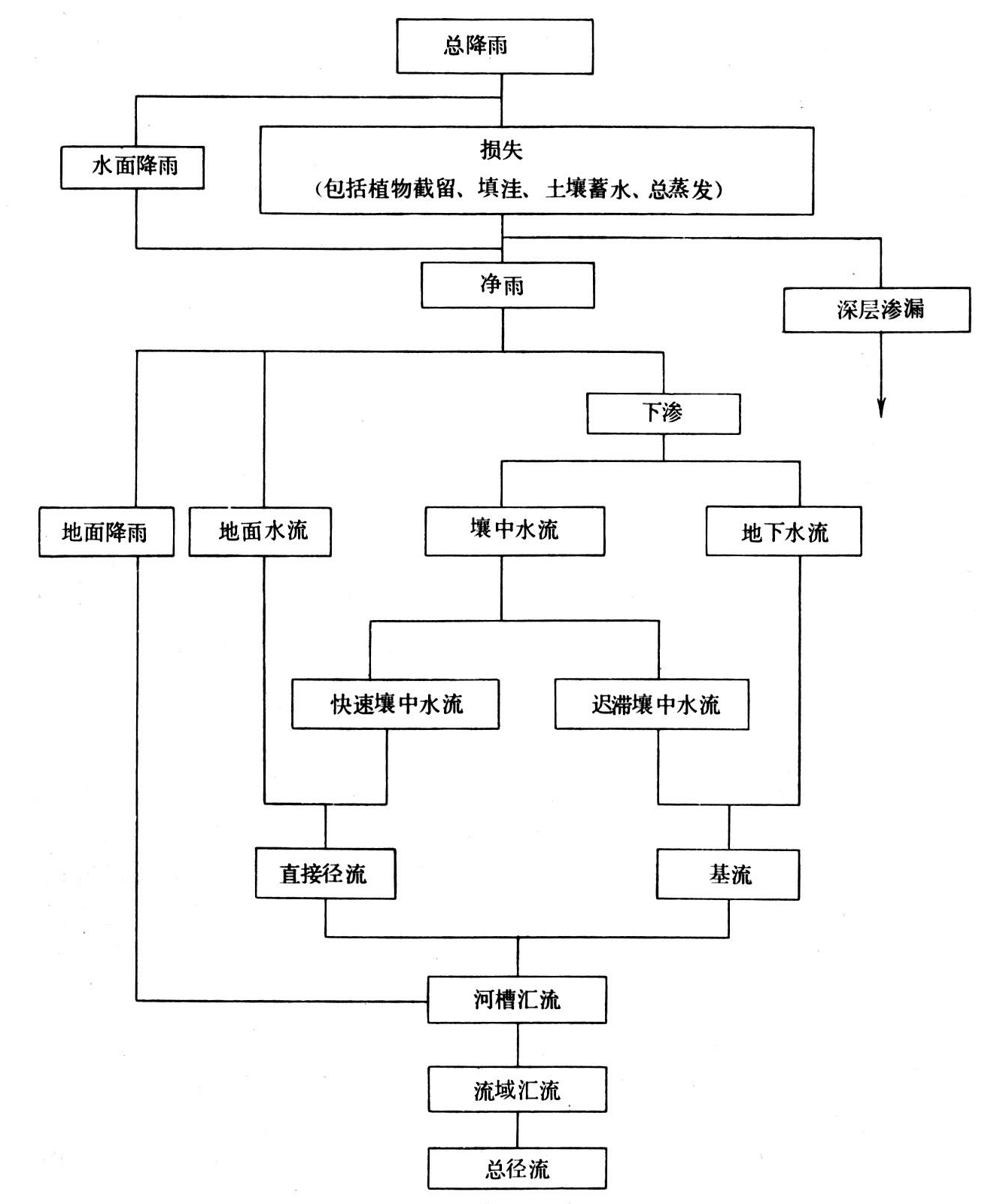 径流形成过程 在降雨形成径流的过程中,包括植物截留、下渗、填洼、流域蒸散发、坡面流、壤中流、地下径流、河槽汇流等,但这些过程又往往交织在一起。①植物截留:降雨被植物枝叶和躯干截留的一部分,成为损失,不参与径流的形成。截留量随降雨特性、植被类别及其郁闭度而异。②填洼:在降雨满足土壤下渗的同时或以后,地表上的坑洼,陆续开始积水,叫做填洼。填洼量随地形和地面情况的不同而异,一般山坡较小,平地较大。③下渗:当雨水降落到有渗水能力的地表以后,即开始在表土层中下渗的过程。下渗率与土壤类别、结构、前期干旱程度、地下水埋深和降雨强度等因素有关。④流域蒸散发:包括水面蒸发、土壤蒸发和植物散发,发生于径流形成的全过程。流域滞蓄的水量,包括植物截留量、填洼量和土壤蓄水量,最终都要消耗于流域总蒸发。降雨期间的总蒸发,直接影响本次径流的形成;雨后的流域总蒸发,则为下一次降雨径流的形成,创造了新的流域滞蓄条件。⑤坡面流:降雨在满足各种损失之后的水量,其中一部分沿坡面向河、沟流动的水流。⑥壤中水流:渗入地下的雨水,当基本满足了土壤包气带(亦称非饱和带)的田间最大持水量以后,一部分沿表土层侧向流入河槽的水流。又根据它们流达河槽的速度,分为快速壤中水流和迟滞壤中水流两种类型。⑦地下水流:下渗水量到达地下水位的部分,一方面用来抬高地下水位,同时又加大地下水水面坡降,以地下径流的形式汇入河槽。⑧河槽汇流:地面水流、壤中水流和地下水流最后都经过小沟汇入河槽。径流在河槽中汇集的过程称河槽汇流。径流形成的全过程见图。