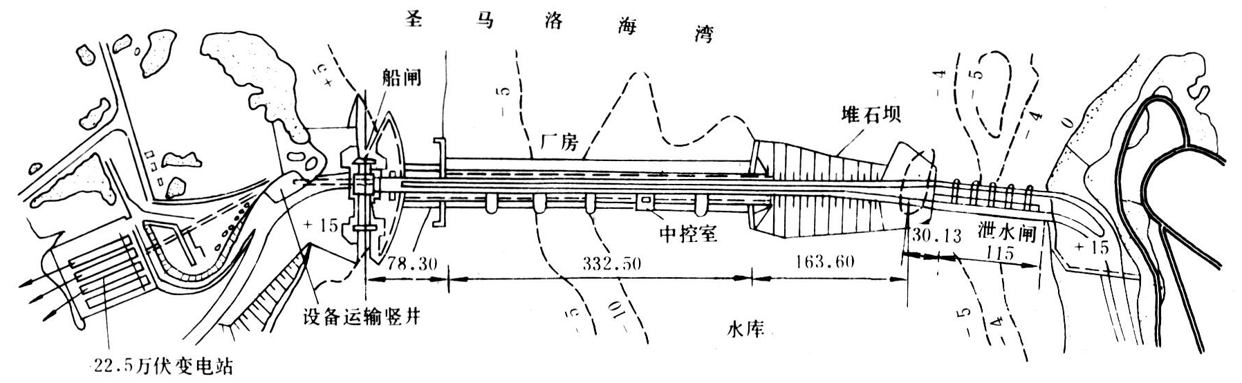 目前世界上已建的最大潮汐电站,位于法国朗斯河河口。电站于1961年开工,1966年8月开始发电,1967年11月工程全部建成。站址处每日潮汐有两次涨落,平均潮差8.5米,最大潮差13.5米。河底基岩为花岗岩。工程包括发电厂房、泄水闸、船闸和堆石坝等,全长750米。水库面积22平方公里,库容1.8亿立方米(见图)。