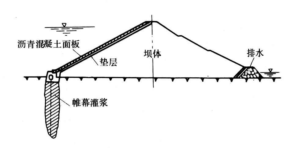 用沥青混凝土作上游防渗面板的土石坝。其组成部分有面板、坝体、垫层及下游排水等。沥青混凝土是沥青、矿粉、砂、石屑和小碎石的胶结物。加热至220℃左右经拌和后运到坝面,约达180℃,将其碾压密实。它不仅具有良好的防渗及适应变形的性能,且具有一定的水稳定性和热稳定性。