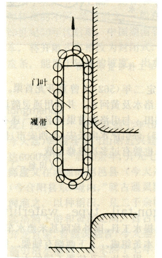 在平面门叶两侧端部安设滚拄链式履带作为支承行走装置的平面闸门,又称链轮闸门(见图)。当门叶启闭时,履带绕门叶的边梁转动,所需启闭力较小。当门叶较高时,为避免履带过长,易于松弛脱落,可将履带分成2~3圈。履带闸门构造复杂,制造维护均较麻烦,造价亦高,故应用不太普遍。