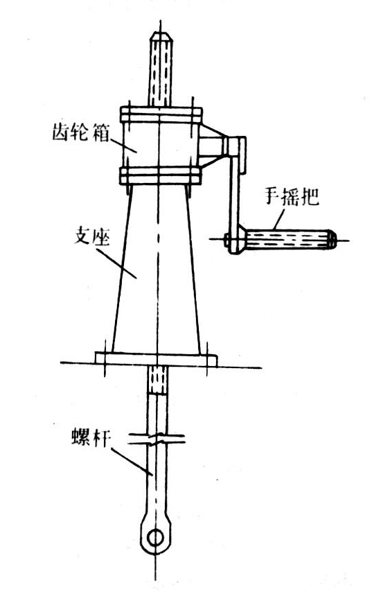 小型螺杆式启闭机如图所示。螺杆支承在承重螺母内,螺母固定在伞形齿轮或蜗轮上(启闭容量在3吨以下的螺杆式启闭机也可不用齿轮减速机构,用手轮直接转动承重螺母),当转动手摇把时,通过齿轮或蜗轮系的传动转动承重螺母,从而升降螺杆和门叶。当采用电力驱动时,手摇把轴上加接变速器和电动机。螺杆式启闭机大都是单吊点的,适用于直升式平面闸门、弧形闸门以及人字闸门。若启闭容量较大或门叶比较宽扁,也可使用双吊点螺杆式启闭机,用连接轴将二台单吊点螺杆式启闭机串连起来,以传递动力和确保吊点的同步。当应用于圆筒闸门时,则需选用三个吊点,三台单吊点螺杆式启闭机在平面上呈品字形布置,同样要用连接轴相互连接,以确保提升圆筒门叶时同步平稳升降。