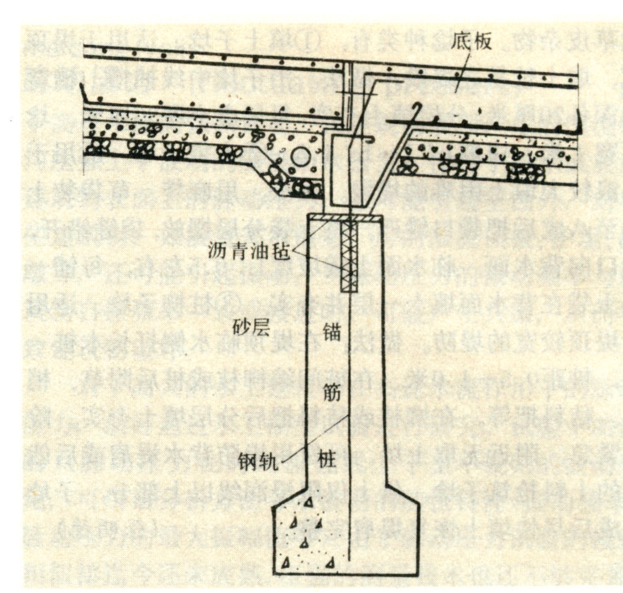 一般先用钻机在地基中钻孔(对于土基常把孔底部直径用爆破等方法适当加大),然后将钢骨架放入孔内,回填水泥砂浆或混凝土。钢骨架上端与底板钢筋联接,使锚筋桩与底板成为整体。底板借助锚筋桩的重量和锚筋桩与地基间的锚固力,使底板与地基较牢固地接合(见图)。以增加底板抗浮稳定性为主的锚筋桩,在外力作用下,承受拉力。以增加底板抗滑稳定性为主的锚筋桩,在外力作用下承受剪力。为增加抗滑效果,锚筋桩在抗滑方向应具有一定的倾斜度。锚筋桩可按钢筋混凝土构件进行设计,锚筋与混凝土之间的握裹力以及锚筋桩与地基间的锚固力要有足够的安全度,不致使锚筋或锚筋桩拔出。锚筋桩的设计理论目前尚不完备,其形式和基本尺寸常参考工程实践经验并通过实验确定。