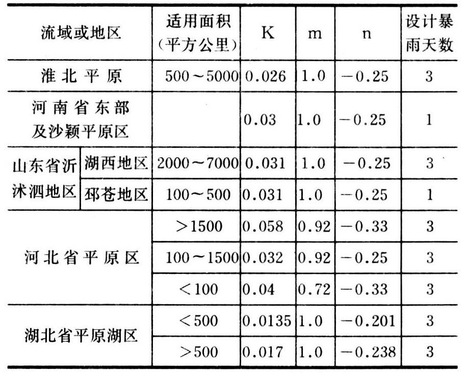 式中 q为设计排涝模数(米3·秒-1·公里-2);K为与流域特性有关的系数;R为设计暴雨径流深(毫米);F为排水断面以上集水面积(公里2);m、n为经验指数。