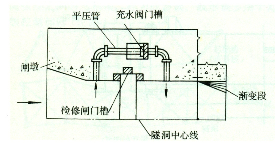 绕过检修闸门联通水库与输水道的旁通管。其功用是向深式输水道检修闸门与工作闸门之间充水,使检修闸门在上、下游水压力平衡的状态下开启,以减小启门力。坝内泄水孔的平压管埋入坝体内,并通往坝内廊道,在廊道内设充水阀控制水流;输水隧洞的平压管埋设在闸墩内(见图),平压管上的充水阀通过阀门井在启闭机室操纵。