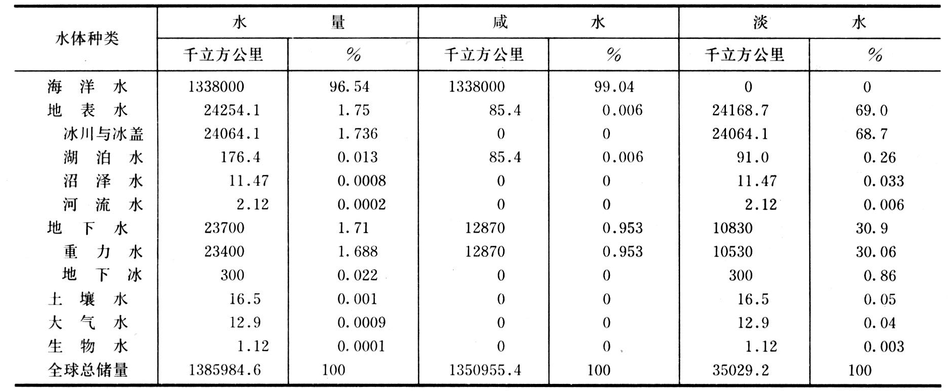 地球水储量 地球表面、岩石圈内、大气层中和生物体内所有各种形态的水,包括海洋水、冰川水、湖泊水、沼泽水、河流水、地下水、土壤水、大气水、生物水,在全球形成了一个完整的水系统,这就是水圈。水圈内全部水体的总储量为13.86亿立方公里,其中海洋储存13.38亿立方公里,占全球总储量的96.5%,其它各种水体储量只占3.5%,地表水和地下水各占一半左右。地球水总量中,含盐量不超过1克/升的淡水仅占2.5%,即0.35亿立方公里,其余97.5%均为咸水。淡水有68.7%,被固定在两极地带的冰盖和高山冰川中,有30.9%蓄存在地下含水层和永久冻土层中,而湖泊、沼泽、河流、土壤中所容纳的淡水还不及0.5%。地球上各种水体储量以及咸水、淡水的分布情况见表1。