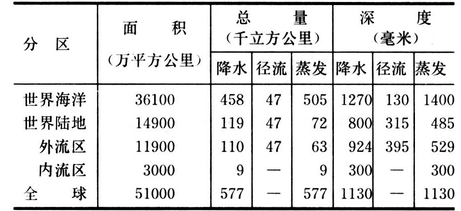 超过降水量130毫米,差值部分由流入海洋的年径流量(包括地下径流)达到平衡。陆地,年降水量为800毫米,年蒸发量为485毫米,降水量大于蒸发量315毫米,差值部分由海洋水汽输送加以补充。从陆地流入海洋的径流和自海洋输送到陆地的水汽,其多年平均水量是相等的