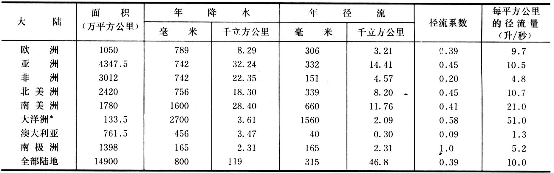 陆地水资源 河流的年径流量,包含大气降水和高山冰川融水产生的动态地表水,以及绝大部分的动态地下水,它反映了水资源的数量和特征,所以各国通常用多年平均河川径流量来表示水资源量。陆地多年平均河川径流量为4.45万立方公里,其中有0.10万立方公里排入内陆湖,其余的均流入海洋。包括2.3万立方公里南极冰川径流在内,全世界年径流总量为4.68万立方公里。径流量在地区分布上很不均匀(表3),有人居住和适合人类生活的地区至多拥有全部年径流量的40%,约1.9万立方公里。各大州的自然条件差别很大,因而水资源量也不相同。大洋洲的一些大岛(新西兰、伊里安、塔斯马尼亚等)的淡水最为丰富,年降水量几乎达到3000毫米,年径流深超过1500毫米。南美洲的水资源也较丰富,平均年降水量为1600毫米,年径流深为660毫米,相当于全球陆地平均年径流深的两倍。澳大利亚是水资源量最少的大陆,平均年径流深只有40毫米,有三分之二的面积为无永久性河流的荒漠、半荒漠地区,年降水量不到300毫米。非洲的河川径流资源也较贫乏,降水量虽然与欧洲、亚洲、北美洲相接近,但年径流深却相差一半,只有150毫米,这是因为非洲南北回归线附近有大面积的沙漠所致。南极洲的多年平均降水量较少,为165毫米,该地没有一条永久性的河流,然而却以冰的形态储存了地球淡水总量的62%。