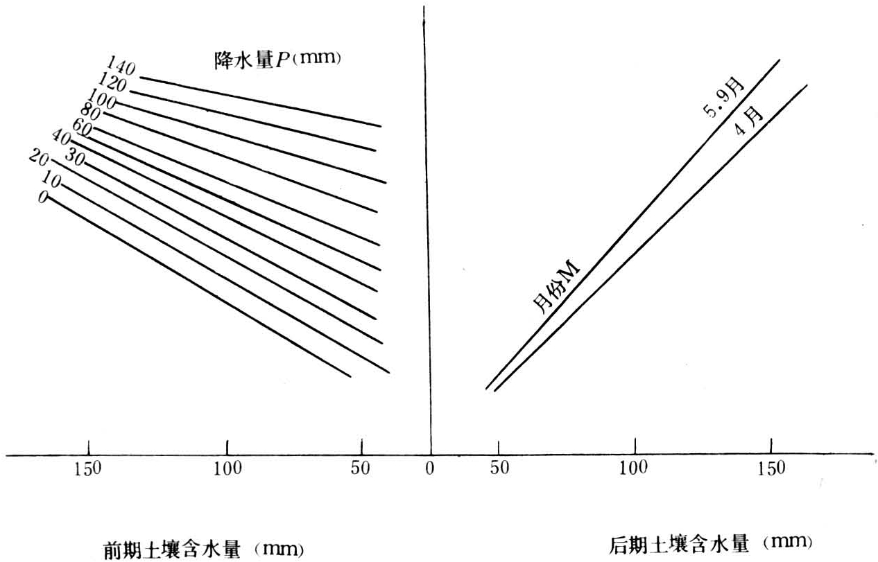 图解法 有的地区在大量实测资料的基础上,把降水量以及用月份反映作物的生育期作出计算时段前期土壤含水量与后期土壤含水量的四变数合轴相关图。预报时可直接查图(见图)。