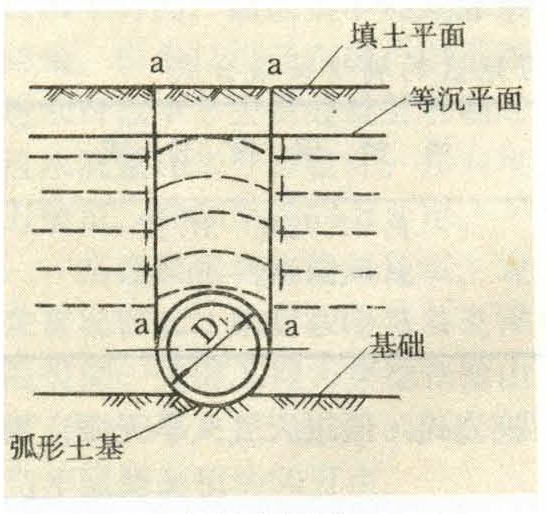 上埋式管的回填土压力与管道刚度有关。在填土作用下可忽略本身变形影响的刚度较大的管道称刚性管,如砖石管、混凝土管及小管径钢筋混凝土管等。刚度较小而容易变形的管道称柔性管,如钢管、钢丝网水泥管及大管径钢筋混凝土管等。填土压力分铅直土压力与水平土压力两种,它们是埋管的主要荷载。①铅直土压力在填土下埋设的管道,由于管的刚度不同,承受的铅直土压力不一定等于管上的土柱压力。如图所示,对于刚性管,管道以上部分填土沉降量小于两侧填土的沉降量,因此,在a—a竖直面上将产生向下的摩擦力。除管上土柱全部重量传给管道外,a—a剖面以外的部分土重也作为附加荷载通过摩擦力传给管道,结果是铅直土压力大于管道上的土柱压力。当管顶填土高度很大时,这一摩擦力并不能在全部填土高度上发挥作用,而仅影响到某高度范围内。超出该高度以上的填土,则呈均匀沉陷,摩擦力已不存在。通常称该水平面为等沉平面。对柔性管,管道所承受的铅直土压力一般认为等于管上土柱压力。②水平土压力。上埋式管在填土荷载作用下,因铅直荷载常大于水平荷载,故埋管将产生横向变形,位移方向与水平土压力方向相反。但横向变形数量微小,可不考虑,水平土压力仍可按静止土压力计算。当管壁侧面为圆弧面时,可近似按矩形分布计算。